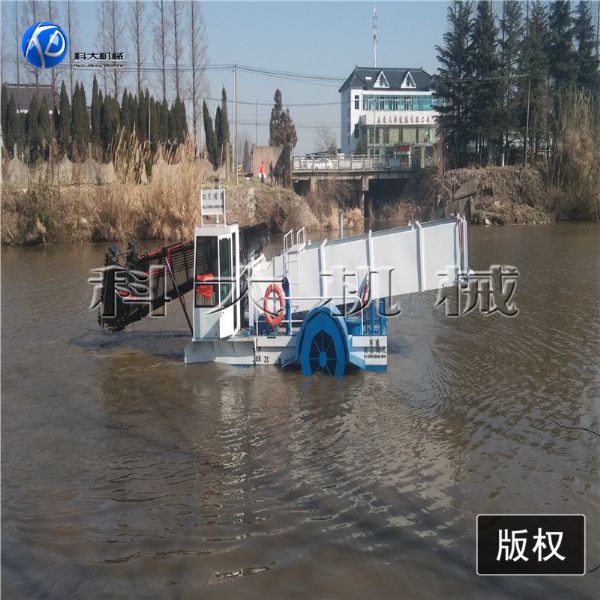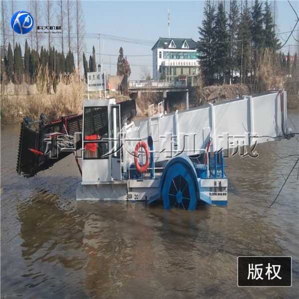 割草船, 是一種集割草、聚攏、打撈、濾水、輸送、卸載等于一體的現(xiàn)代化水草、水葫蘆收割設備。所有操作程序采用全液壓控制,簡單、方便、靈活,是城市水面景區(qū)的保潔設備,也可作為垃圾清理船、湖面保潔船均收到良好的效果。